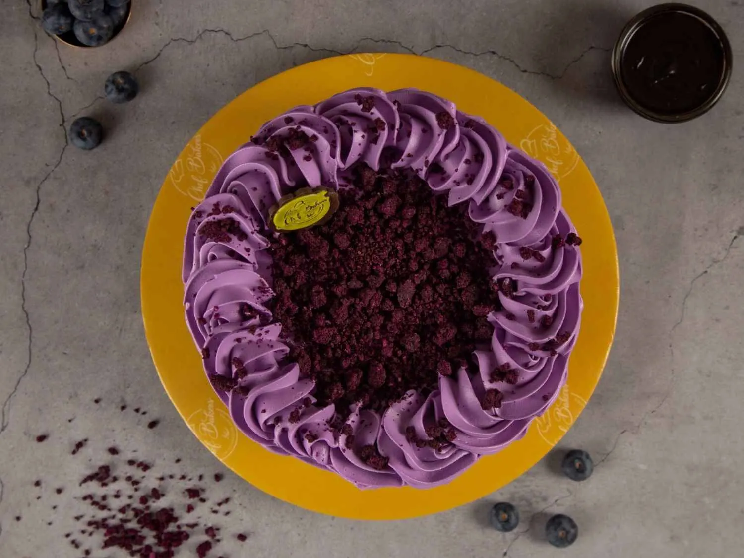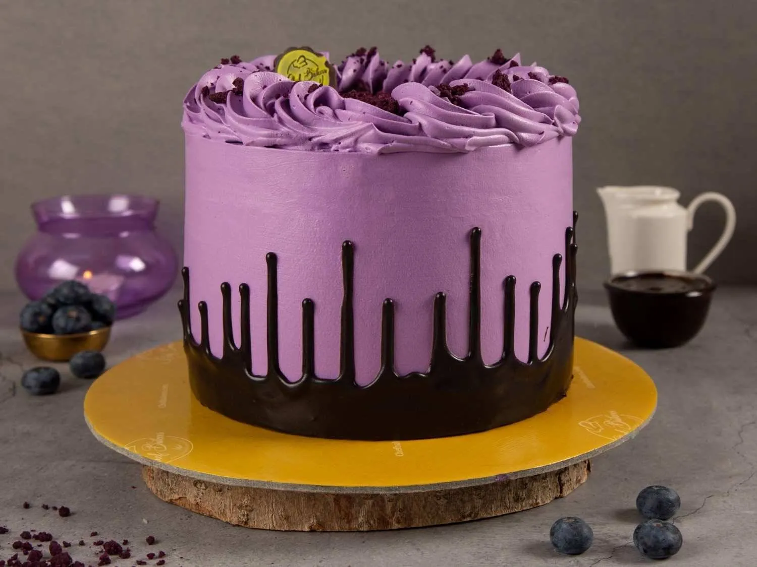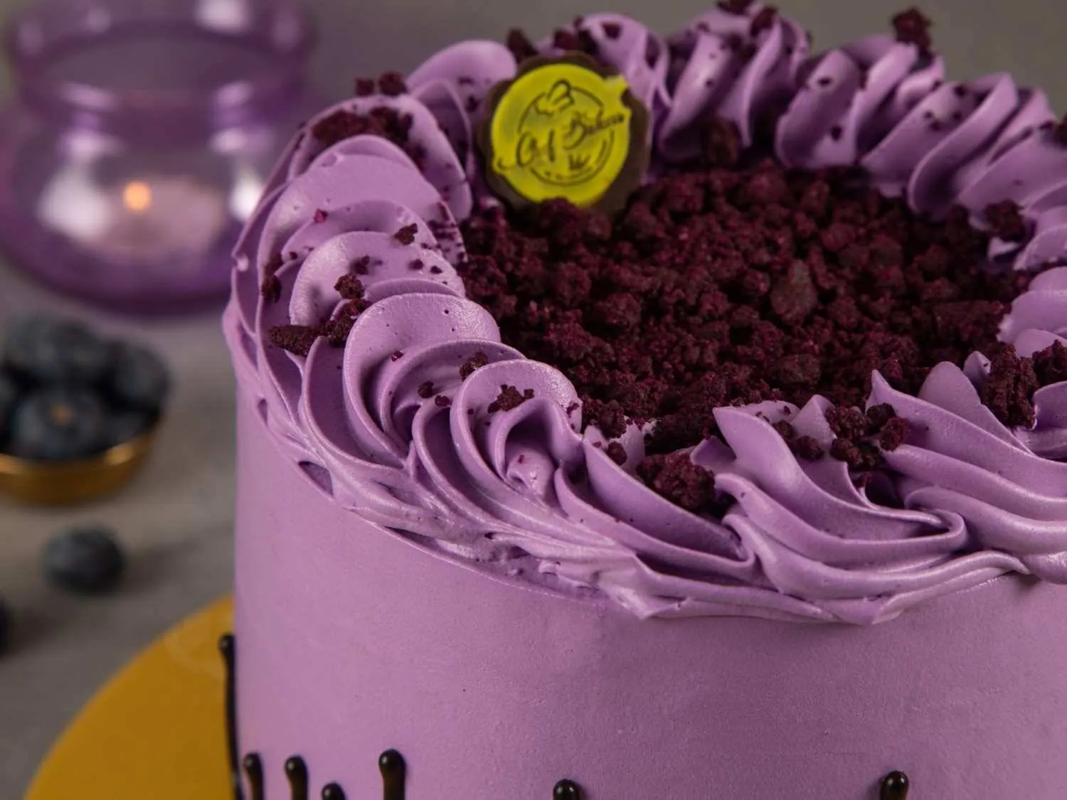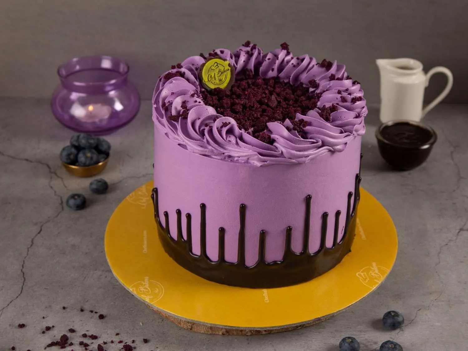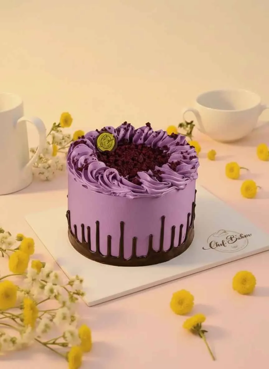 Blueberry Purple Gateaux – A soft sponge cake layered with blueberry cream and compote, finished with a vibrant purple glaze for a fruity and elegant dessert.