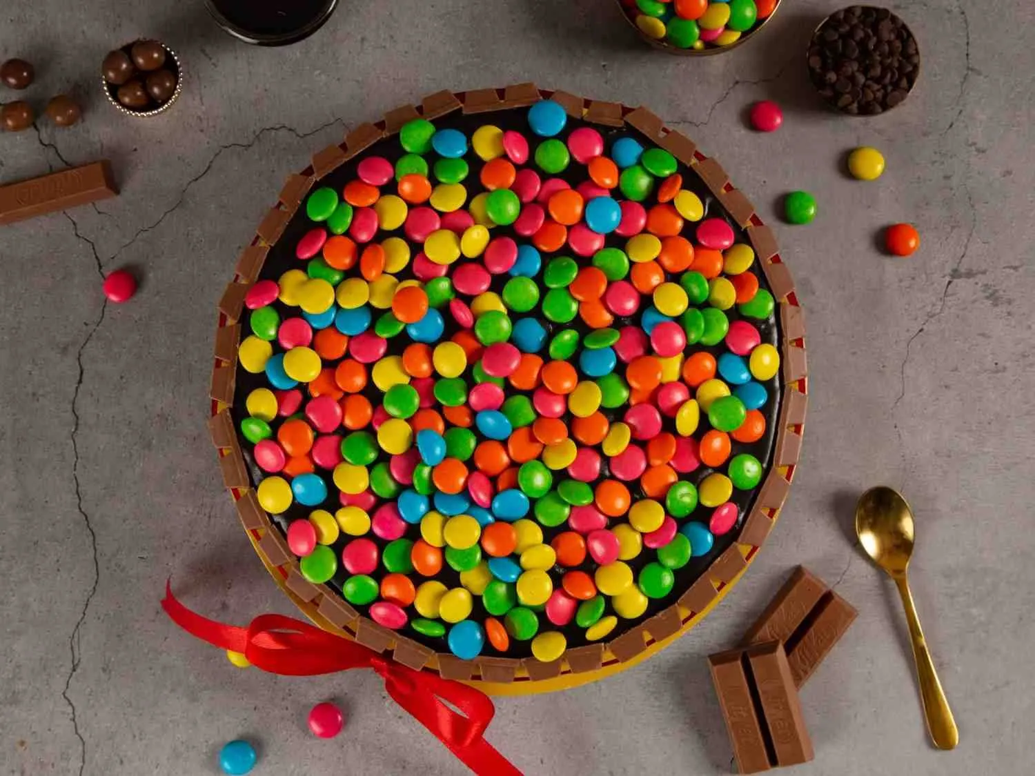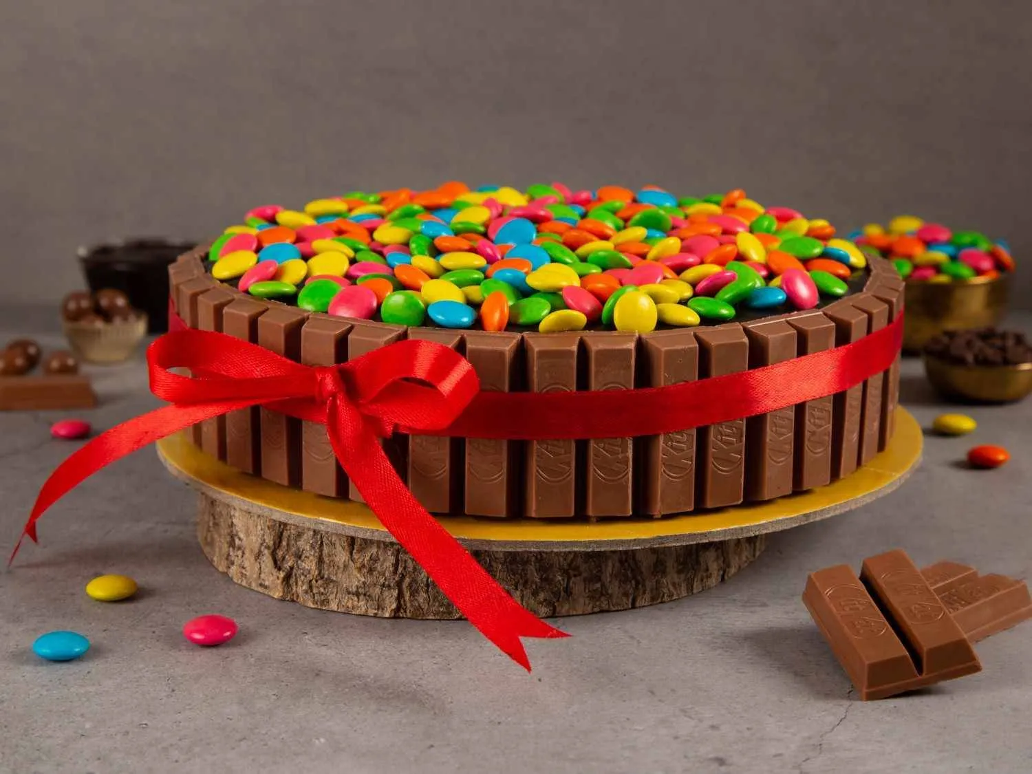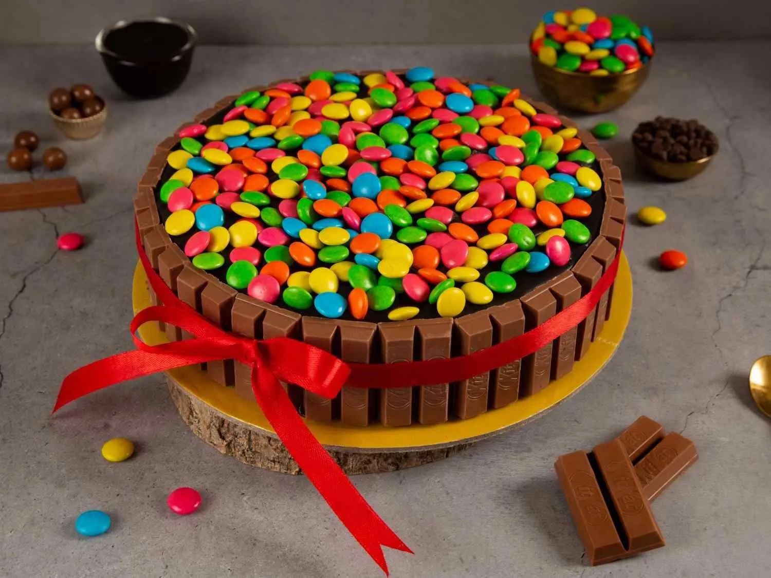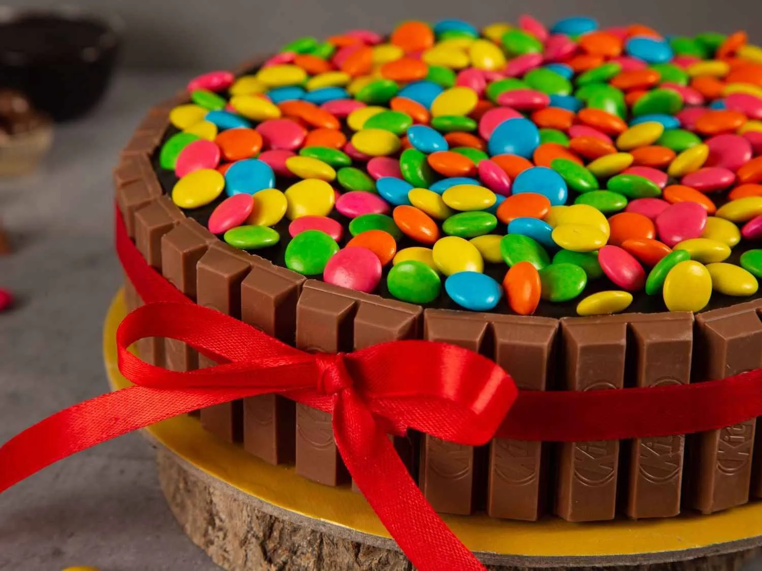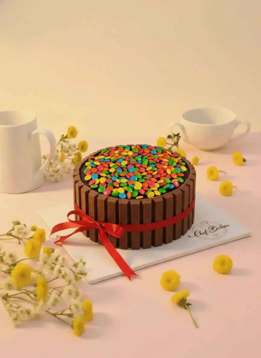 Kitkat Gem Paradise Cake topped with crunchy KitKat bars and colorful gems, layered with rich chocolate cream for a fun and indulgent treat.