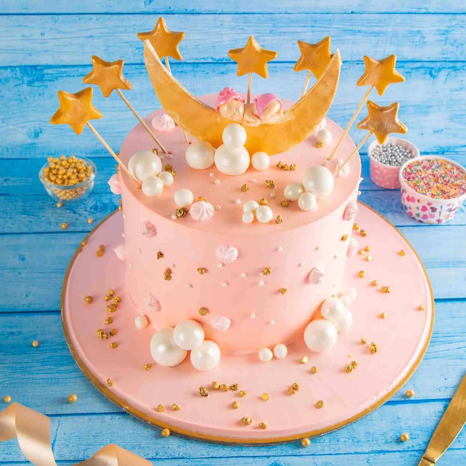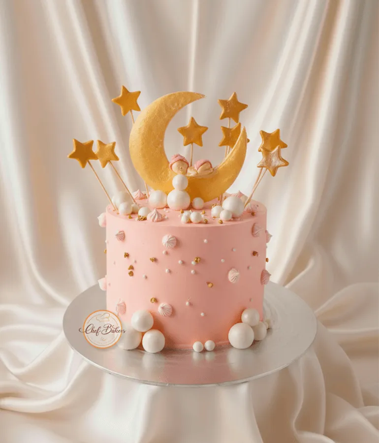 Adorable baby on the moon cake with stars and clouds — ideal for showers, birthdays, or gender reveals.