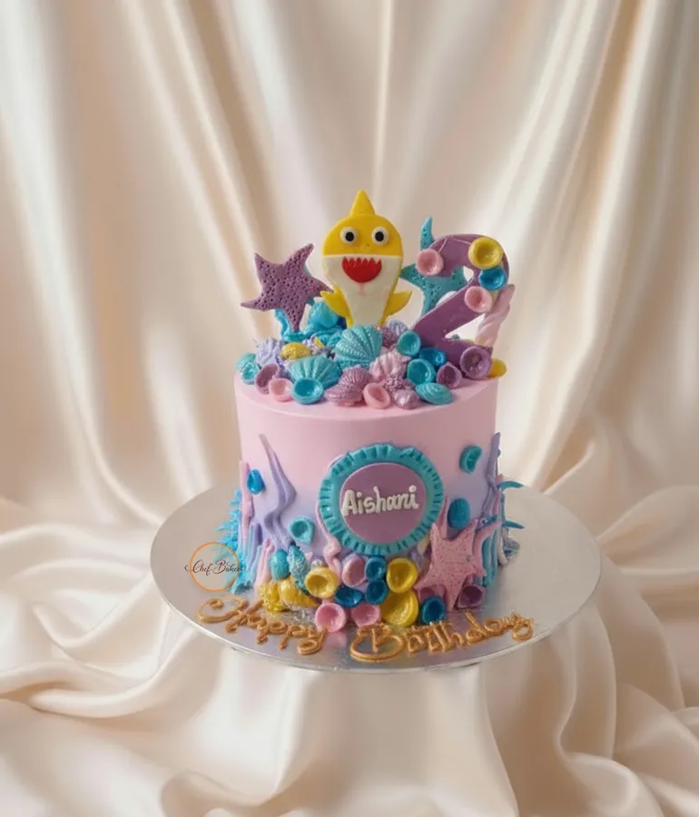 Cute ocean-theme cake with Baby Shark topper, sea shells, starfish and coral details in pastel colors—ideal for kids’ parties and themed events.