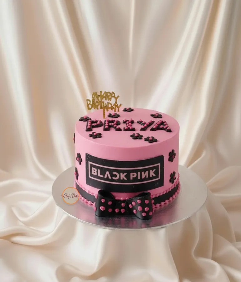 Pink Blackpink themed cake with logo design, cute bow and custom name topper—perfect for K-pop birthdays. Choose your flavor, size and message.