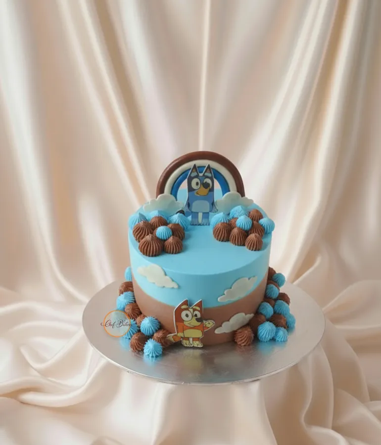 Celebrate with this fun Bluey and Bingo cake, featuring colorful frosting, clouds, and a rainbow design for a perfect kids’ birthday party.