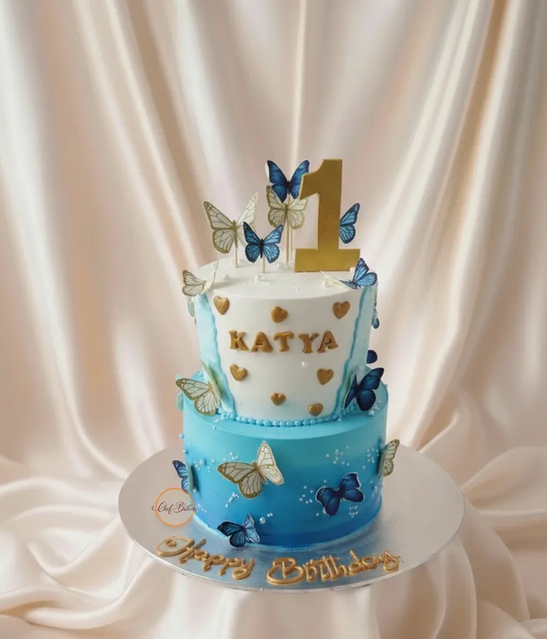 A stunning two-tier cake with blue ombre design, gold accents, and delicate butterfly decorations, perfect for a 1st birthday celebration.