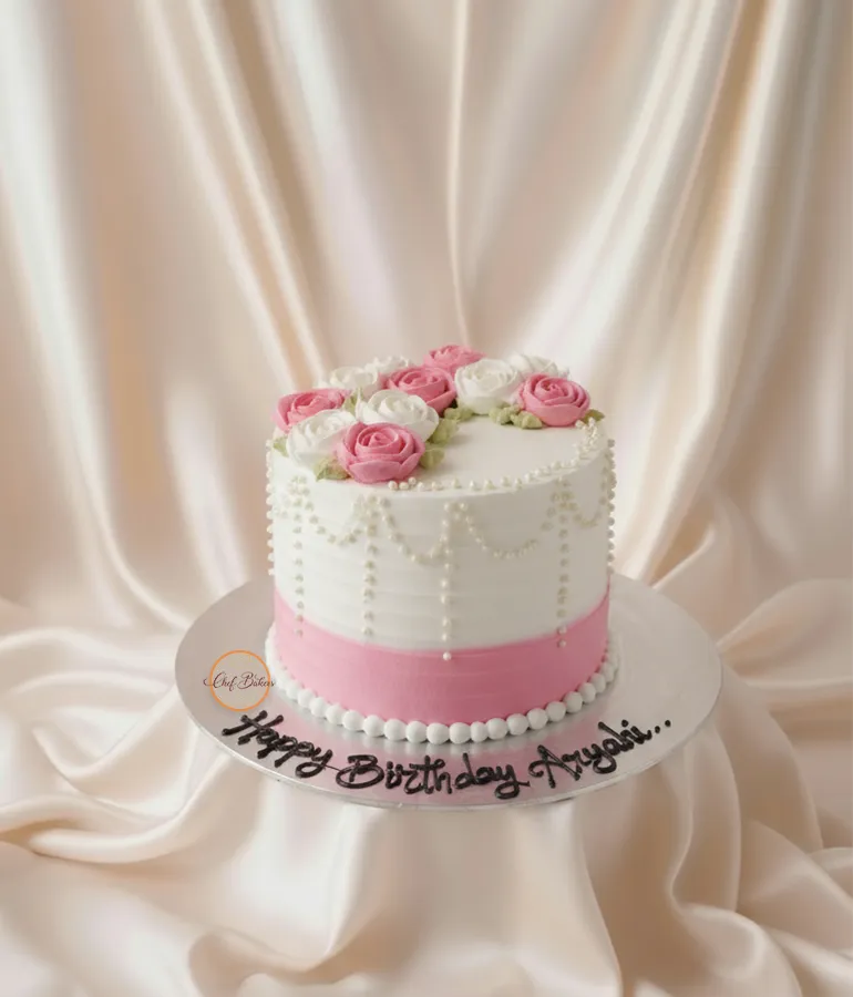 Elegant pink & white birthday cake with buttercream roses and pearl drip design. Ideal for birthdays and anniversaries. Custom flavors and message available.