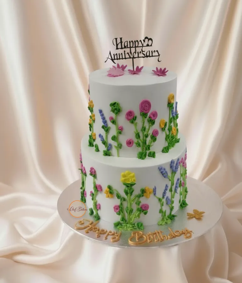 Beautiful two-tier cake with hand-piped buttercream wildflowers and custom topper. Perfect for birthdays & anniversaries. Choose your flavor, size and text.