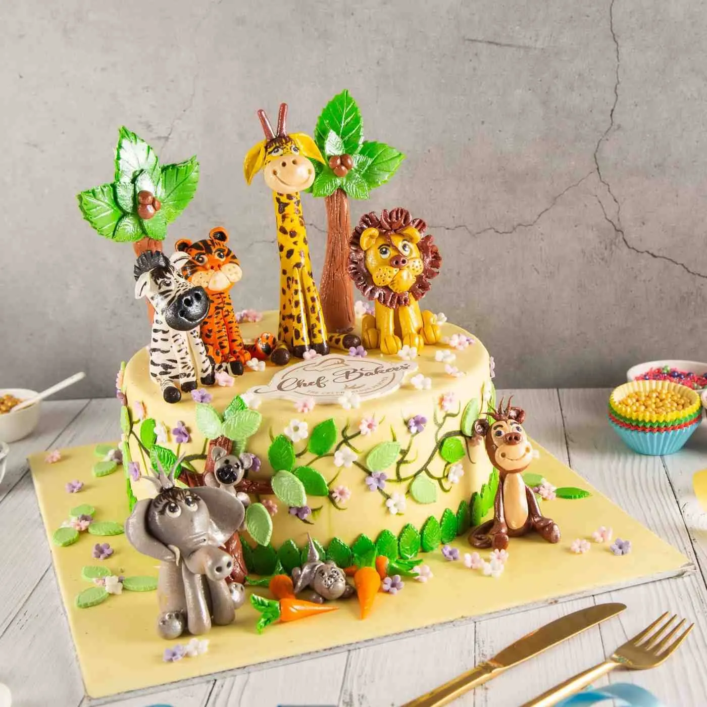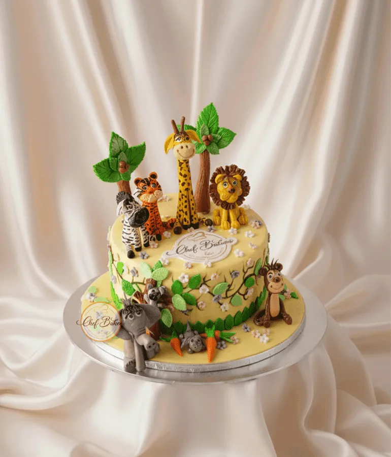 Fun jungle cake with adorable animal toppers — perfect for kids’ birthdays and wildlife-themed celebrations.
