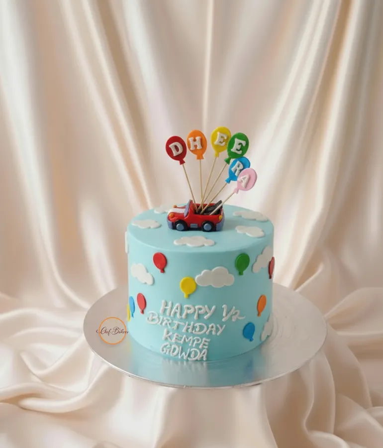 A playful cake with colorful balloons, a toy car topper, and cloud accents, perfect for a fun and joyful celebration.