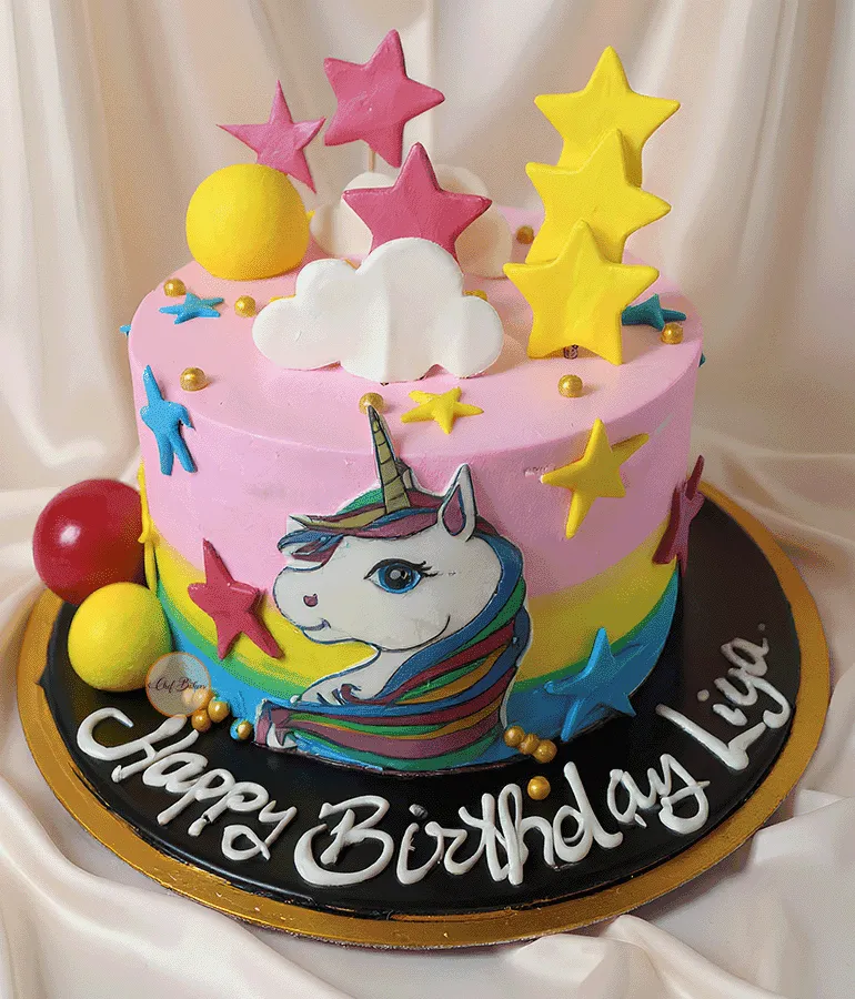 Rainbow unicorn birthday cake with stars, clouds and custom name—perfect for kids’ parties. Choose your flavor, size and message for a magical celebration.
