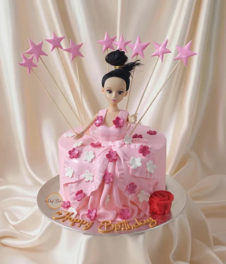 Delight in this stunning pink doll birthday cake with star toppers, flower decorations for a magical celebration.