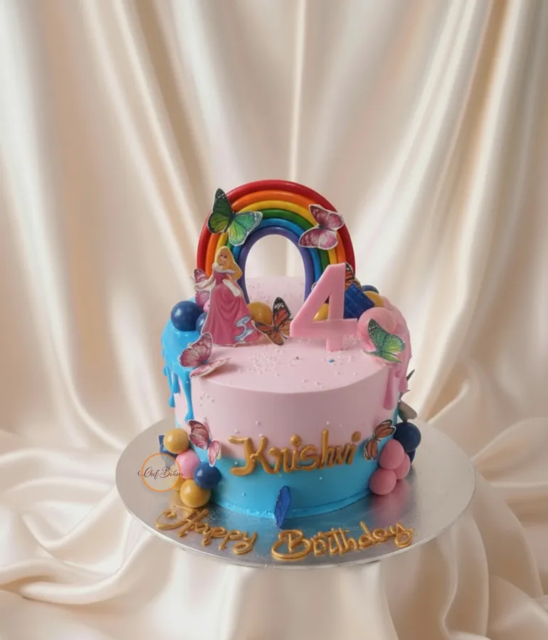 A colorful 4th birthday cake featuring a princess, rainbow, and butterfly decorations, perfect for a fun and vibrant celebration.