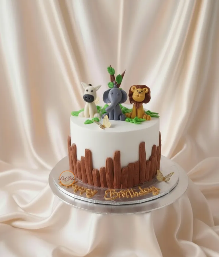 Adorable safari cake with handmade animal toppers, leafy accents, and a rustic bark-texture finish—perfect for jungle themes and kids’ parties.
