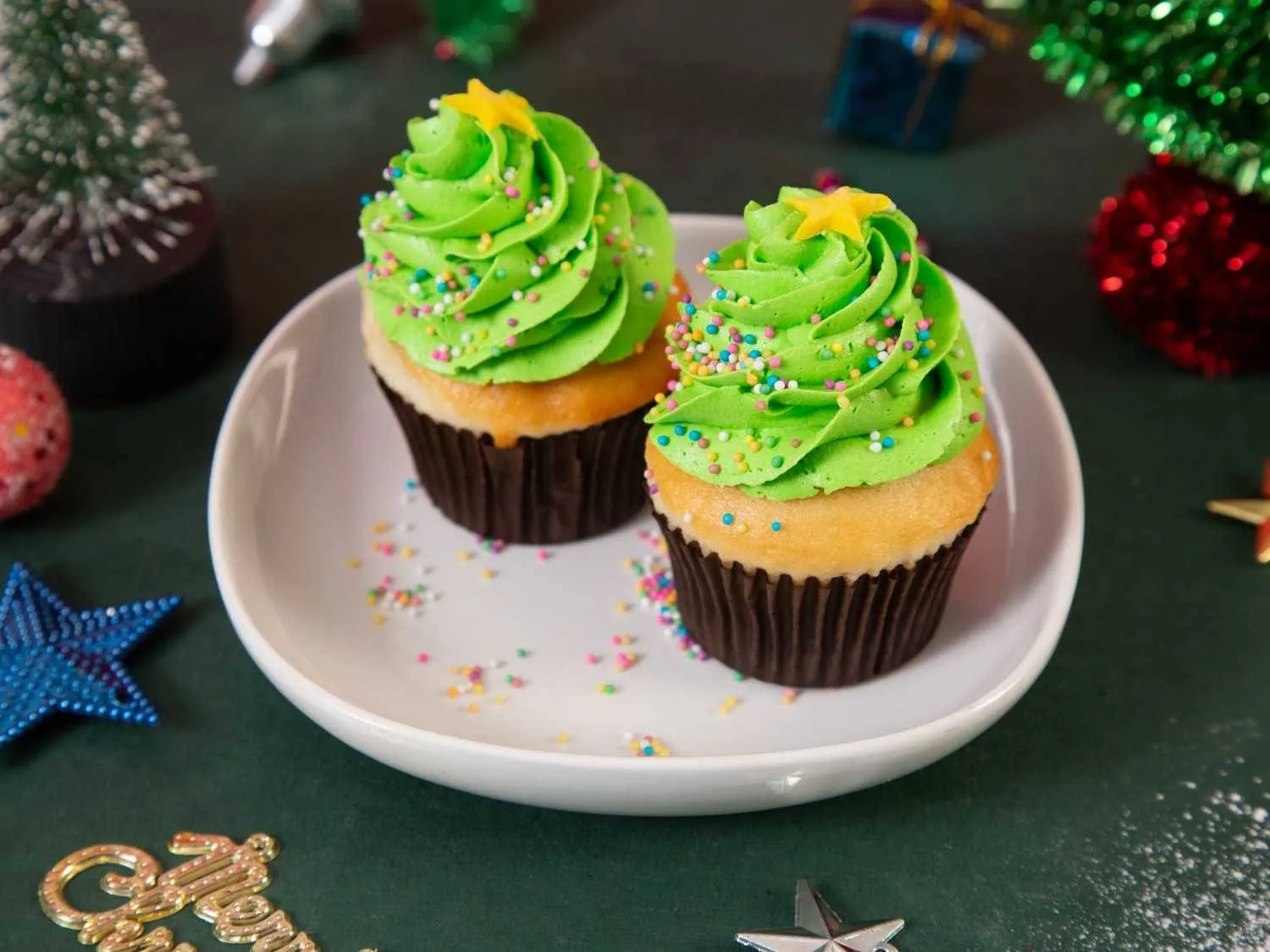 Festive X-Mas tree cupcakes, decorated with green frosting and colorful ornaments—perfect for adding a sweet touch to your holiday celebration.
