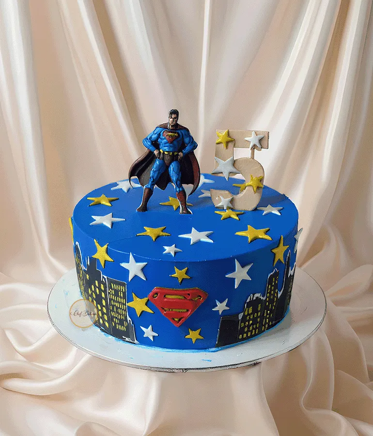 Superman themed cake with city skyline and star design—perfect for superhero birthdays. Custom name, age, flavor, size and colors available.