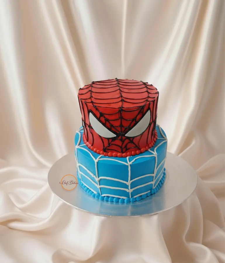 Bold two-tier Spider-Man cake with red mask top, web piping, and blue base—perfect for superhero themes, kids’ parties, and comic fans.