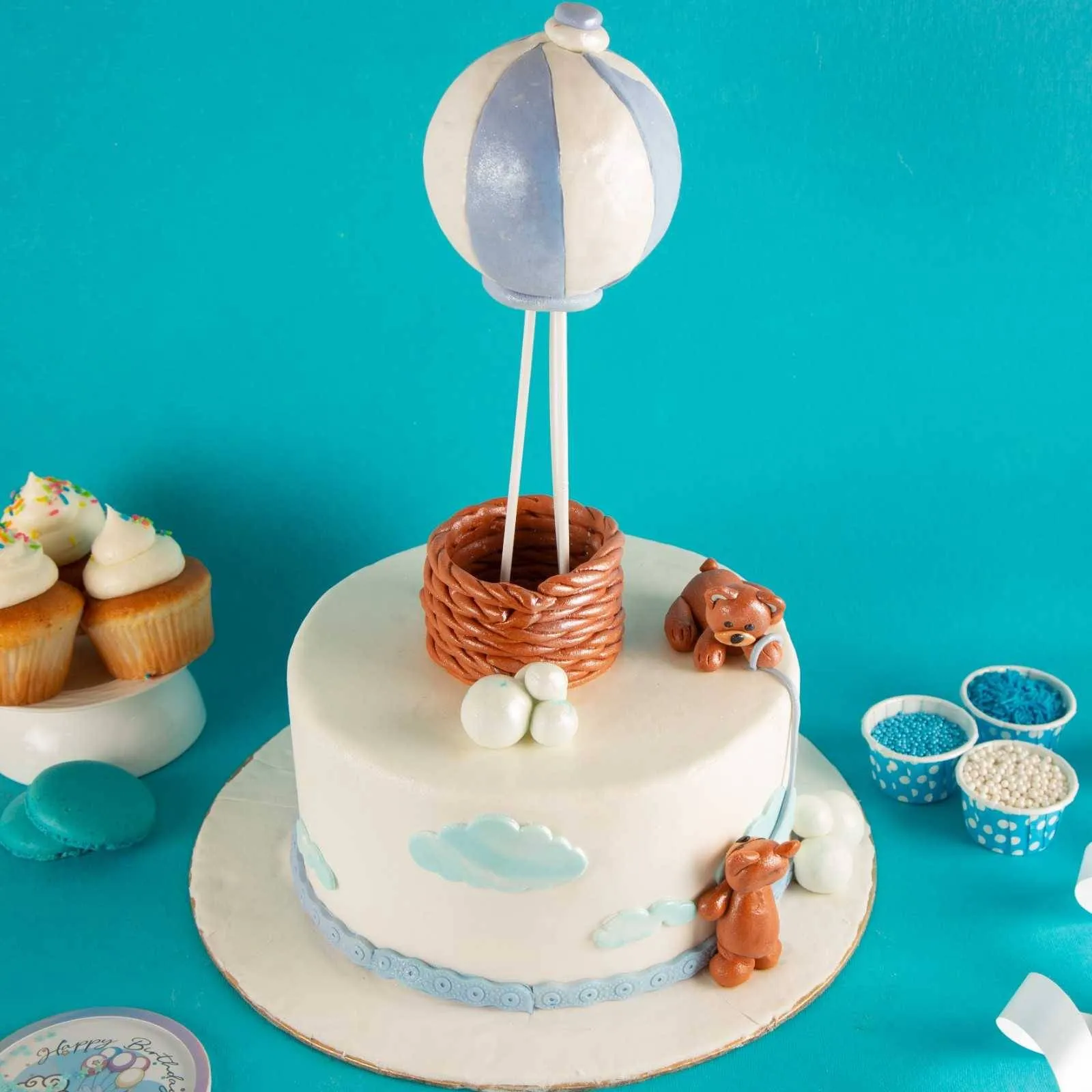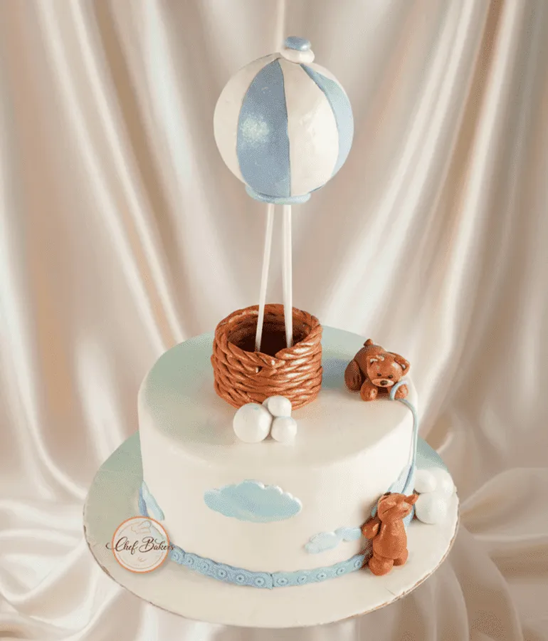 Adorable Winnie the Pooh cake with balloon and bear toppers — perfect for kids’ birthdays and baby showers.