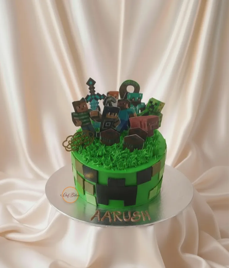 Minecraft-inspired cake with Creeper design, grassy top, and 3D character toppers—perfect for gaming parties and themed celebrations.