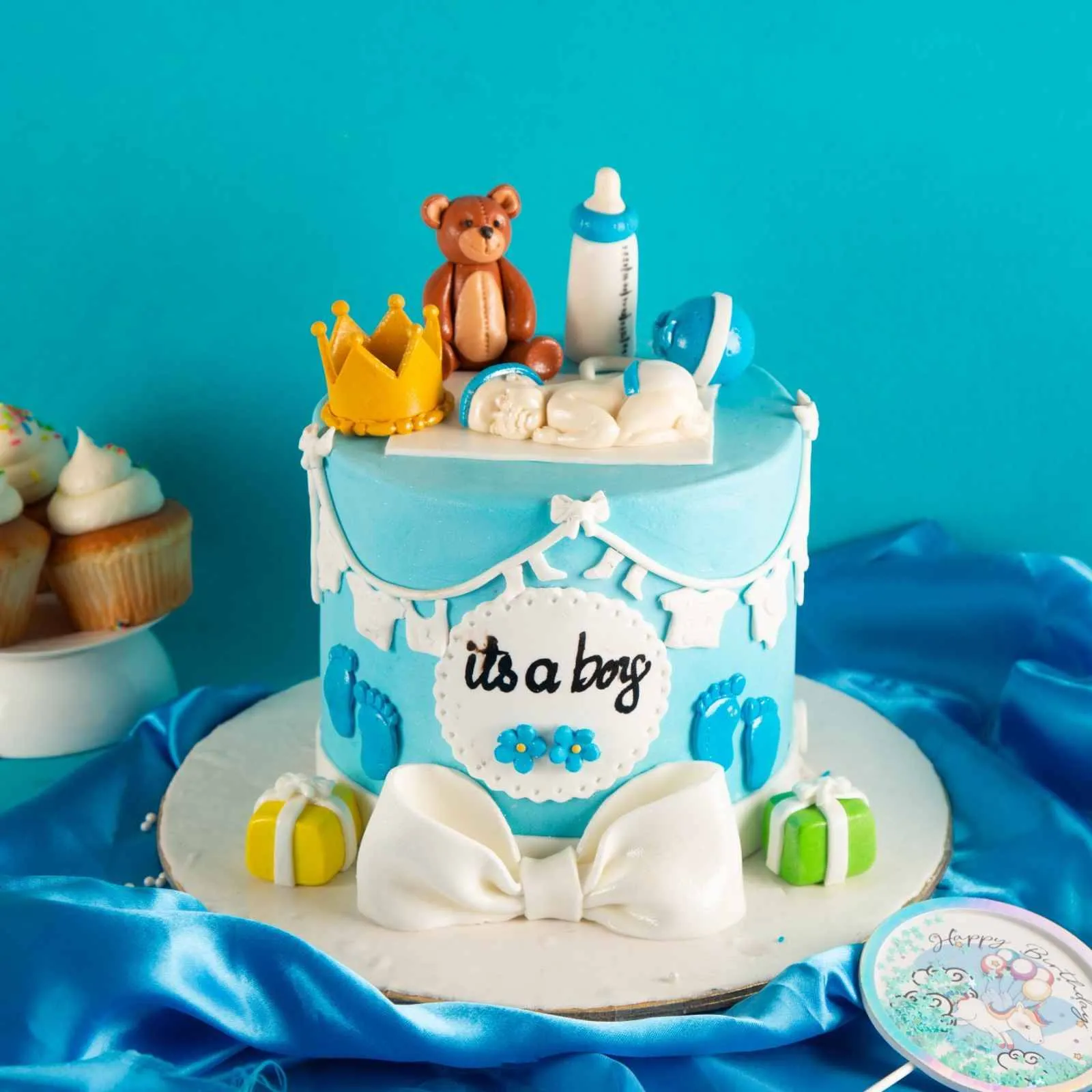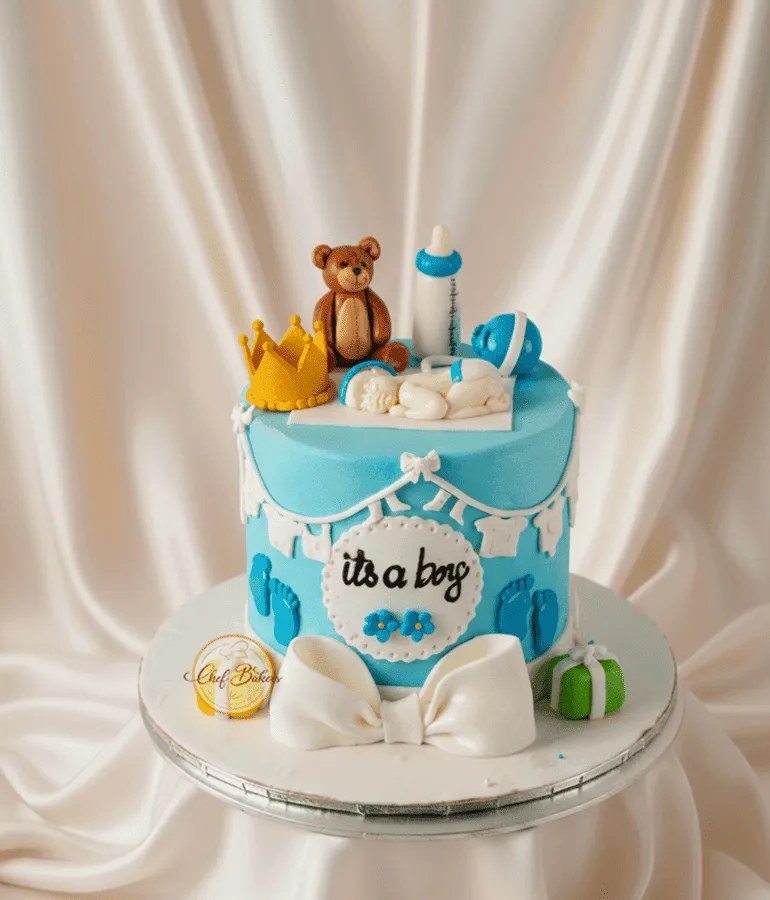 Adorable blue baby shower cake with teddy bear, crown, and baby décor — perfect for welcoming a little boy.