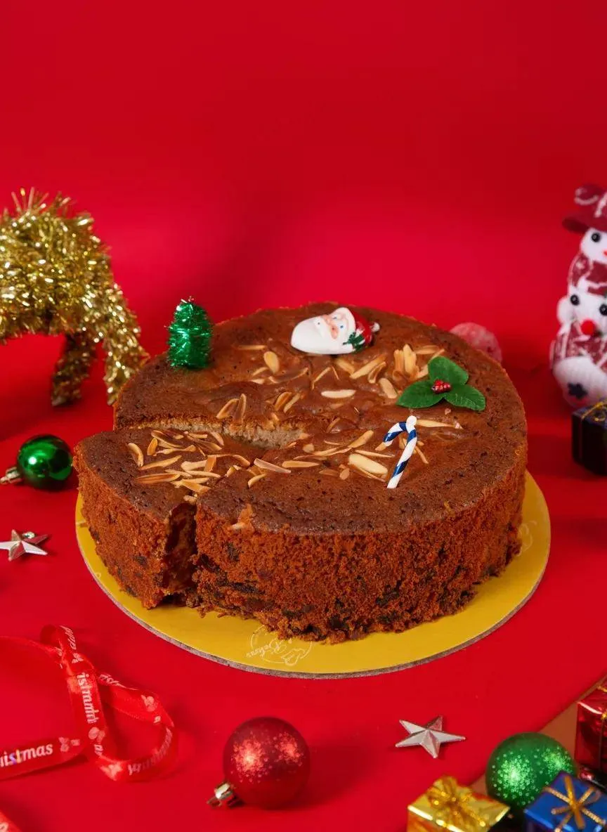 A traditional Scottish fruit cake with a rich, nutty flavor, topped with almonds and packed with dried fruits, perfect for festive occasions.