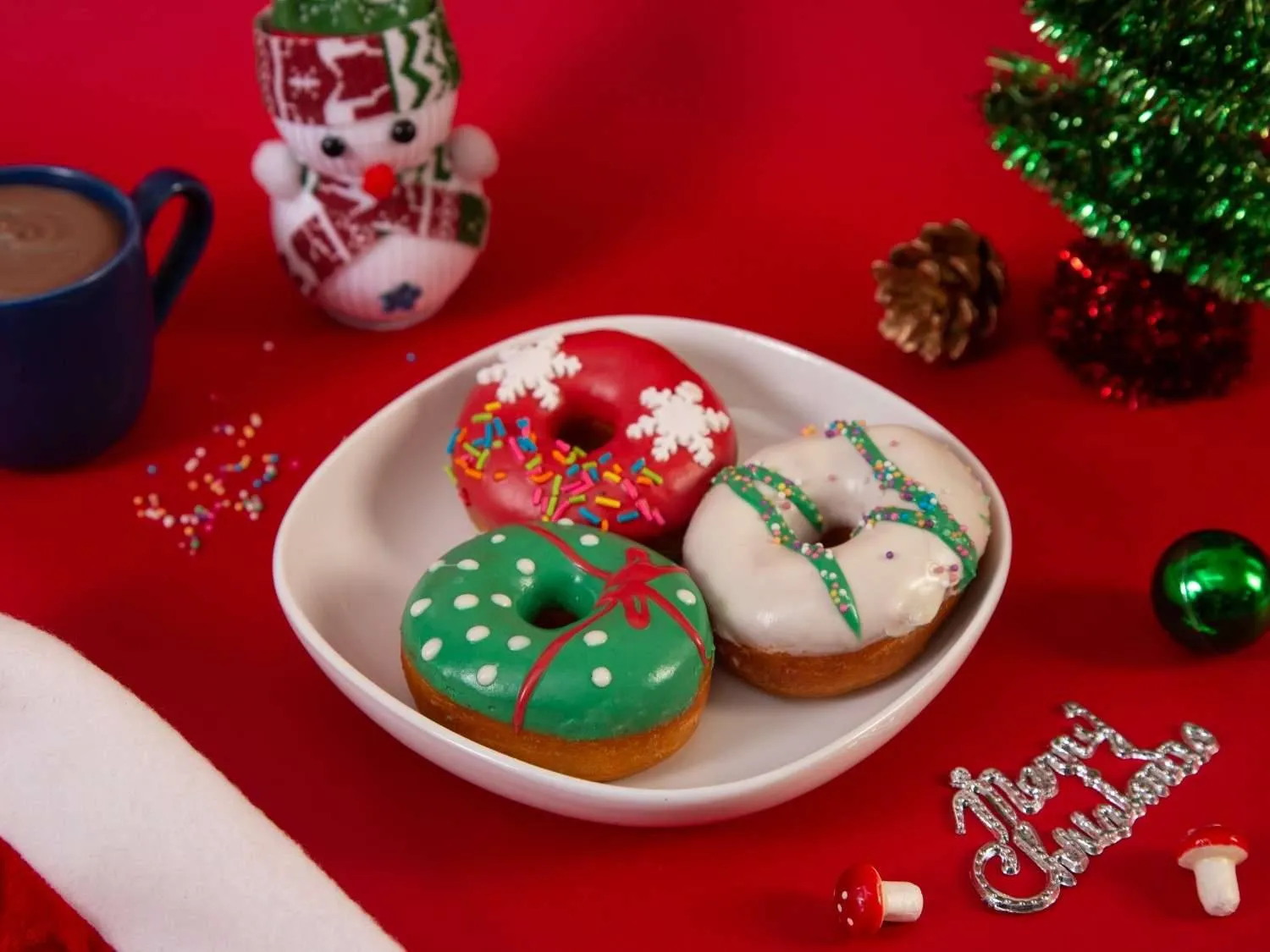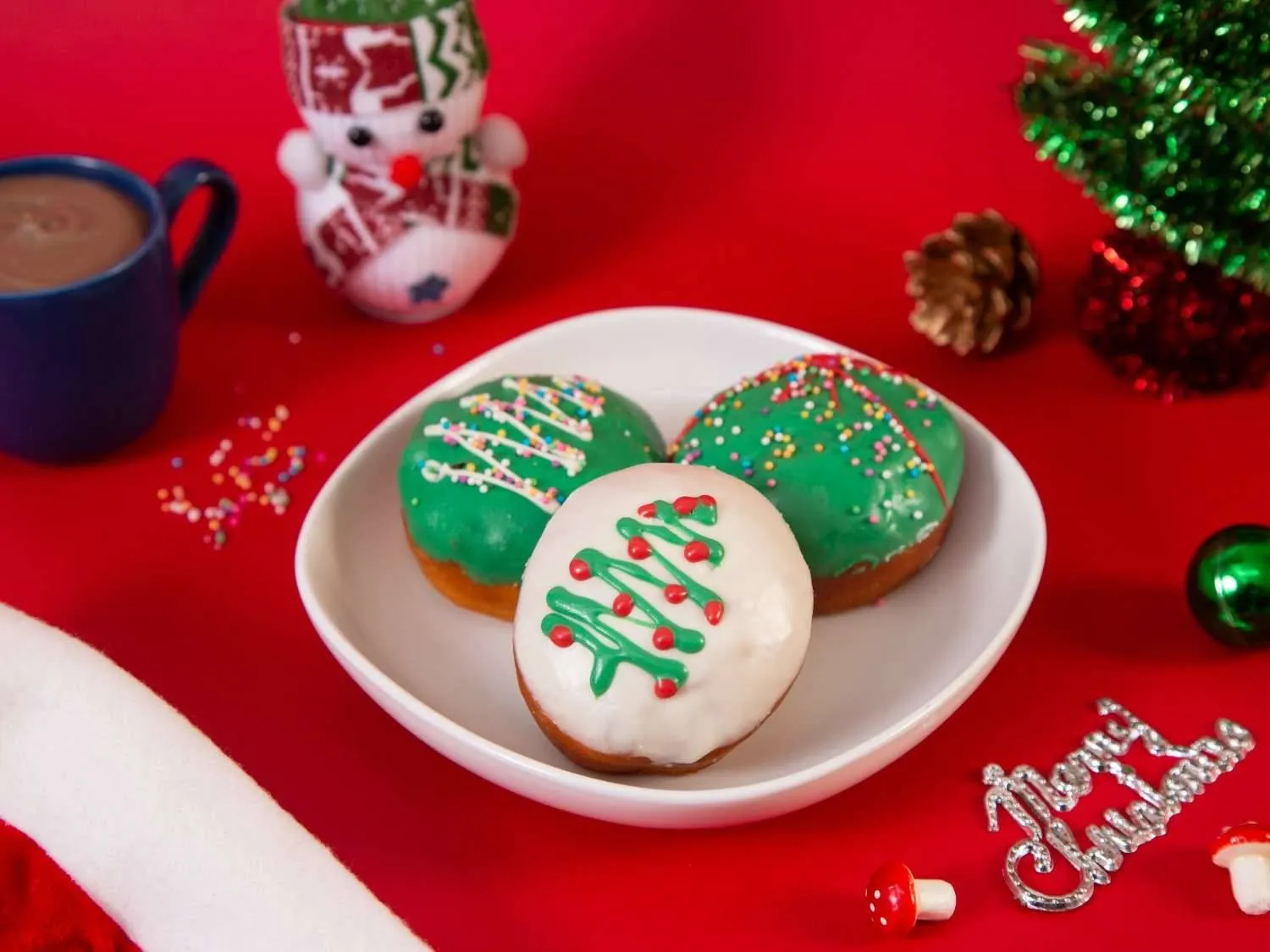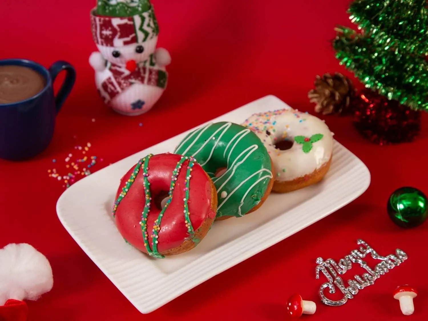 Festive X-Mas donuts glazed in vibrant red, green, and white, decorated with holiday sprinkles—perfect for adding sweetness to your celebrations.