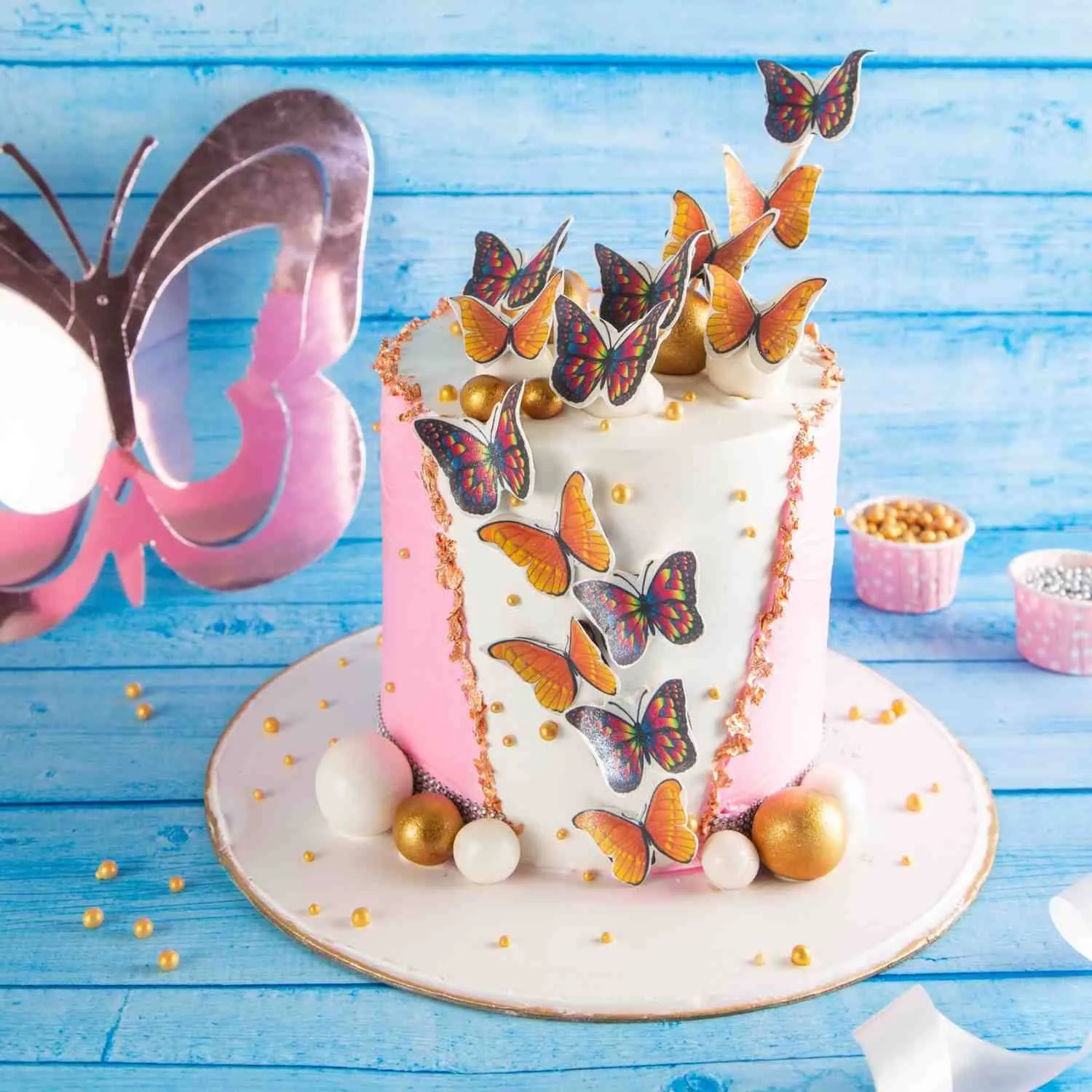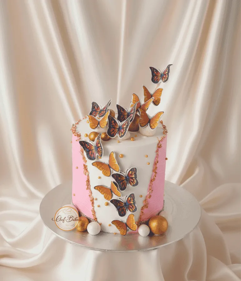 Beautiful butterfly cake with colorful butterflies and golden details — perfect for birthdays and celebrations.