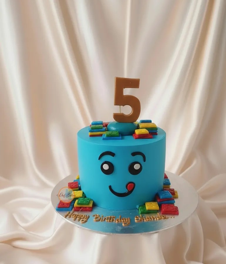 A cheerful birthday cake featuring a smiley face design and colorful building blocks, perfect for a playful and fun celebration