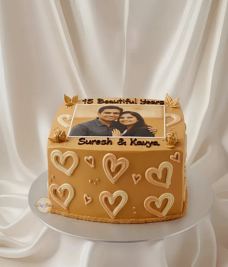 Beautiful 15-year anniversary photo cake with heart patterns and custom couple image. Ideal for milestone anniversaries and special celebrations.