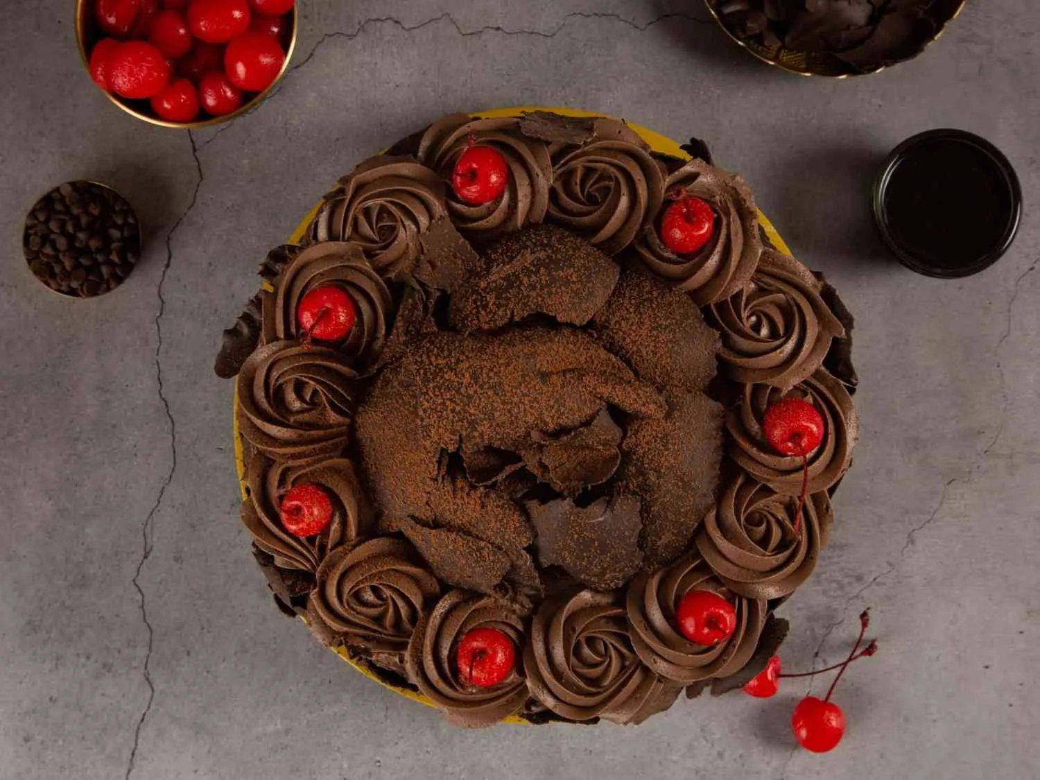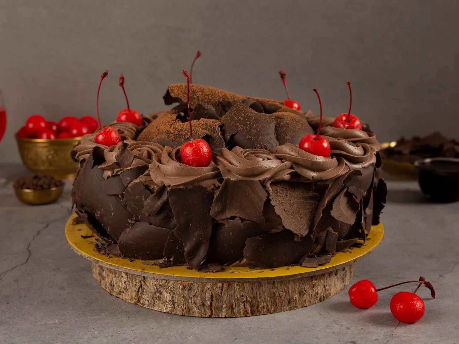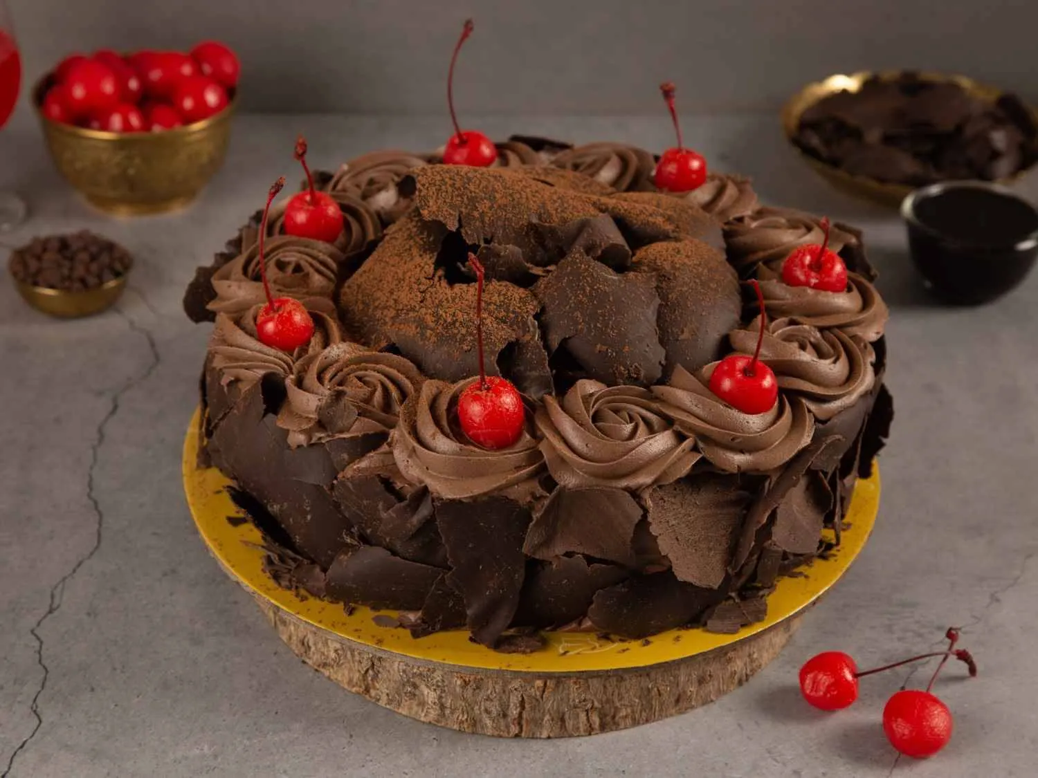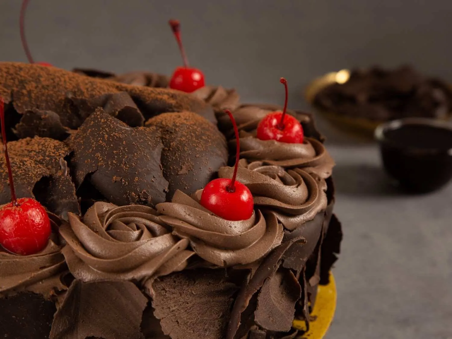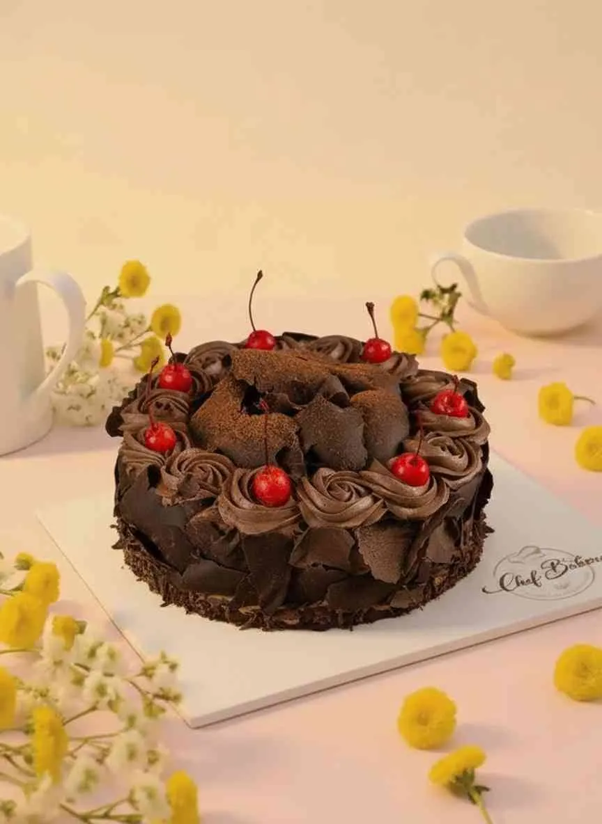 German Choco Forest Cake with moist chocolate sponge, whipped cream, and cherries, crafted for a rich and indulgent dessert experience.