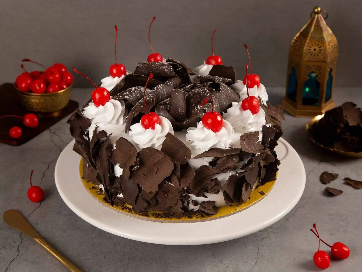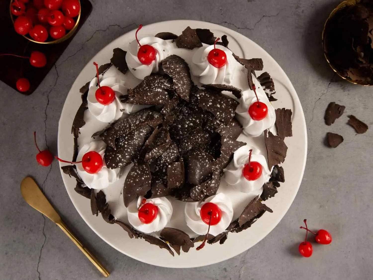 Black Forest Cake – A classic German chocolate sponge layered with whipped cream, cherries, and chocolate shavings for a rich, indulgent treat.