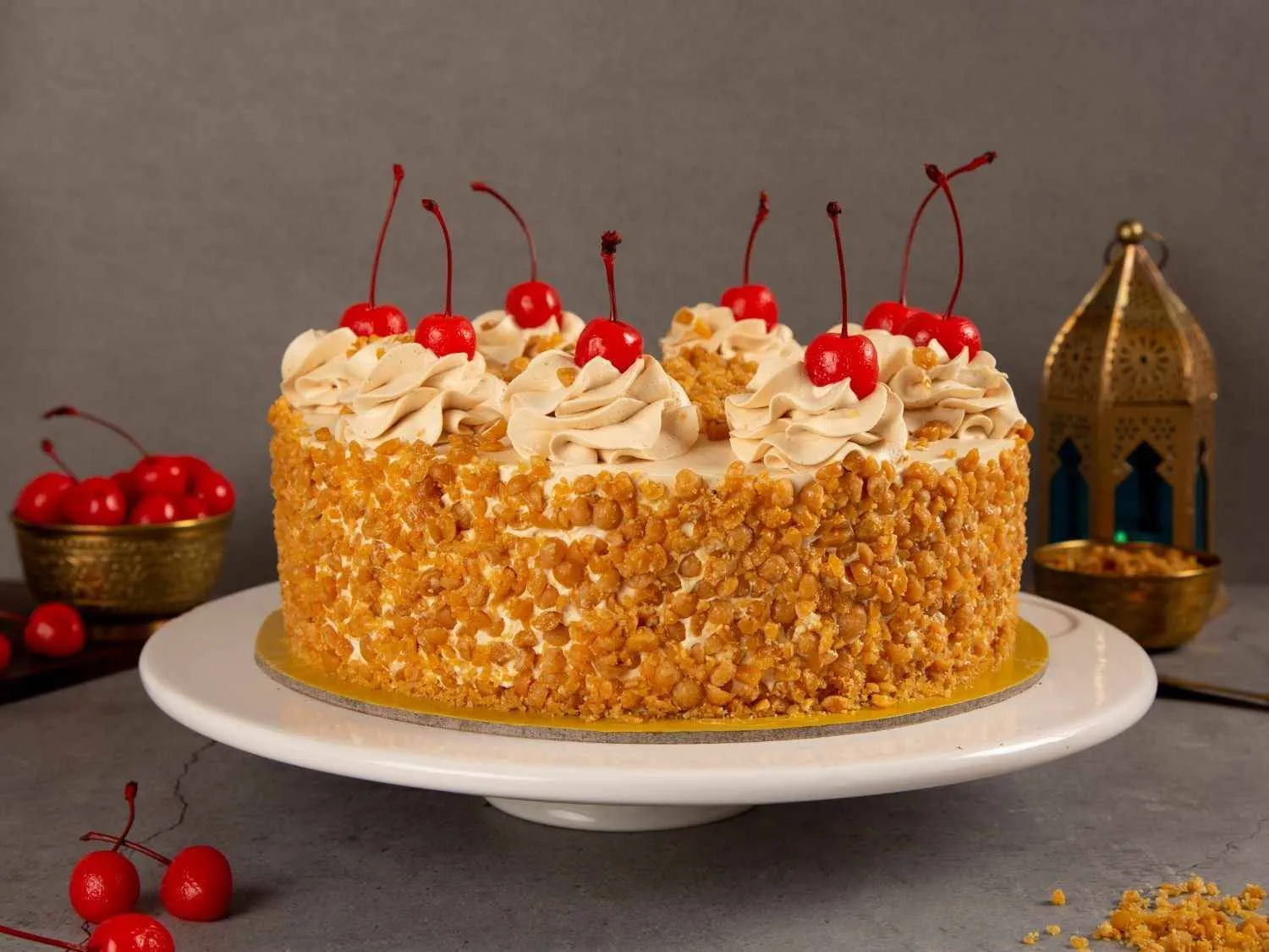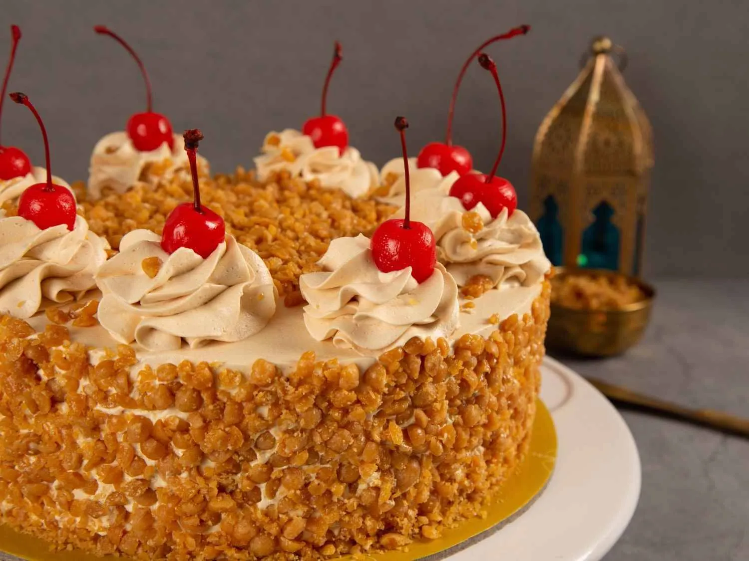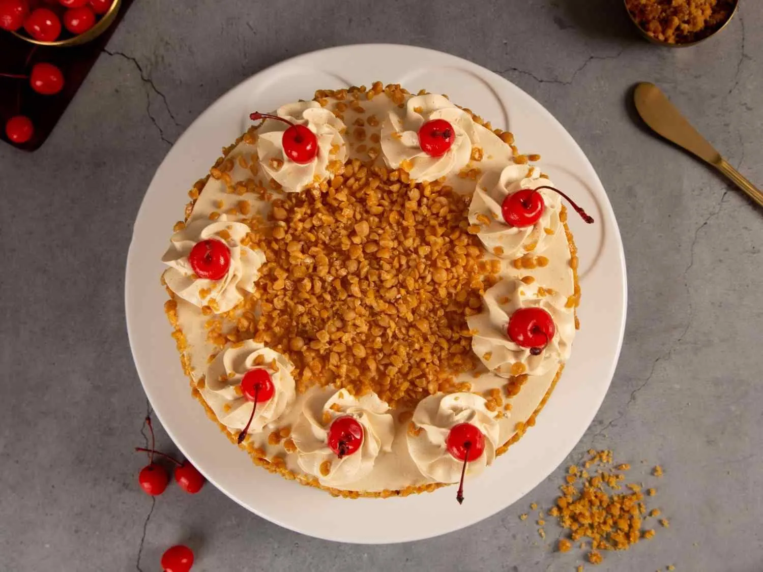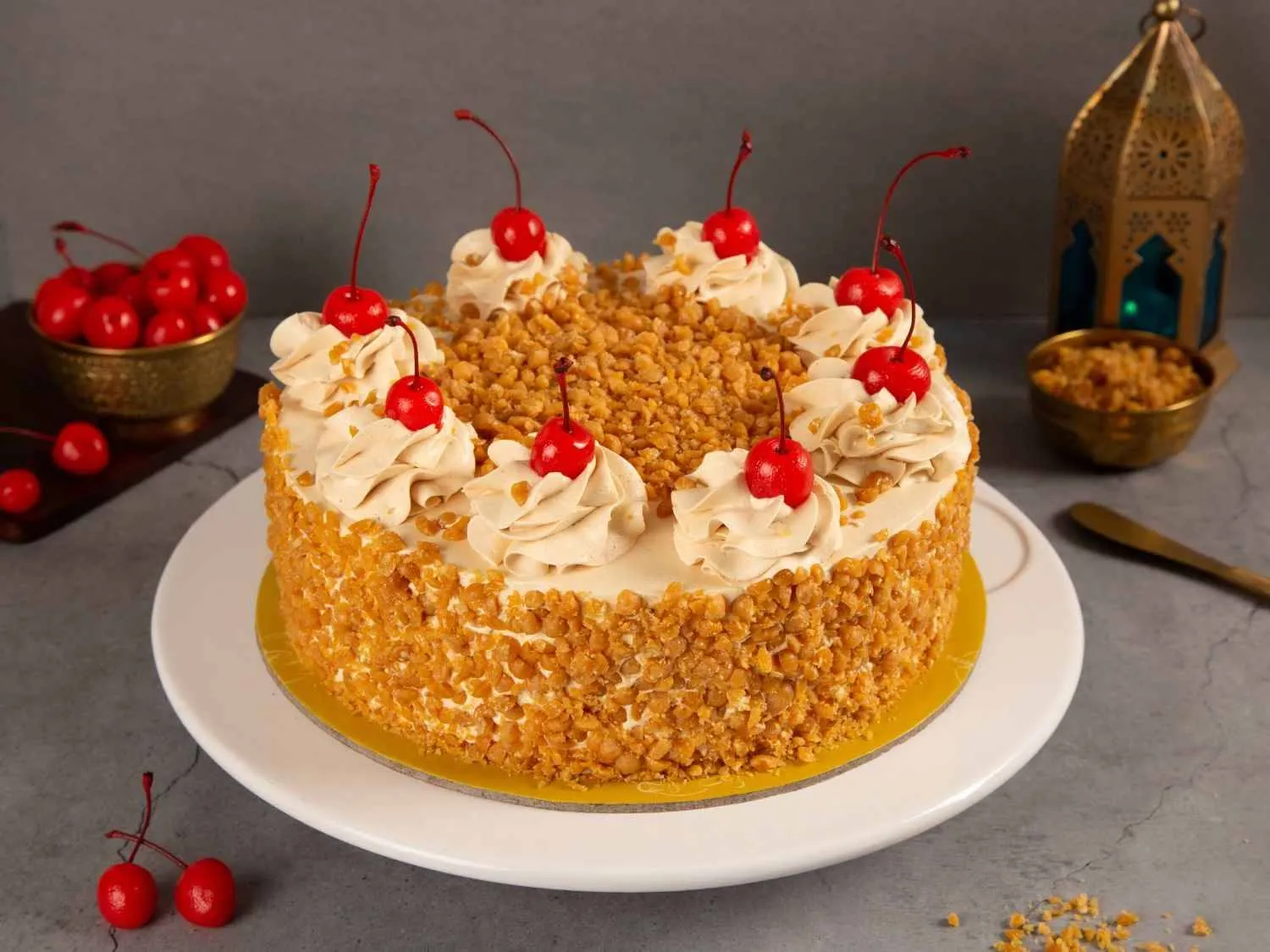 Butterscotch Cake – A soft sponge layered with caramelized butterscotch crunch and whipped cream, offering a sweet and nutty delight.